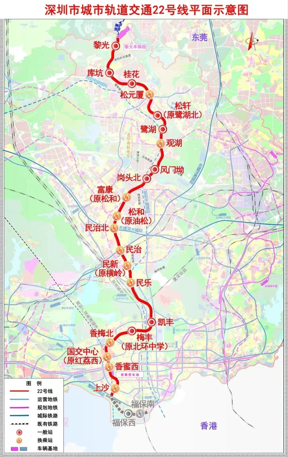 22号线一期 工程起于 上沙站 ,途经福田区、龙岗区、龙华区,止至 黎光站 ,预留向北延伸至东莞的条件,线路全长 34.7 公里。
